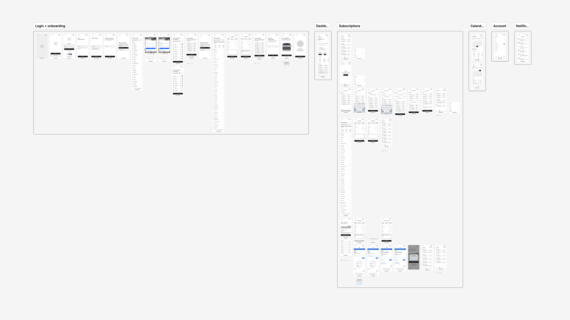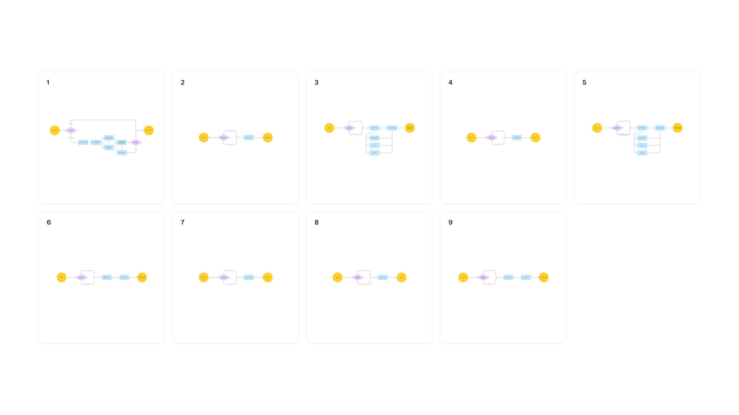 Putting together user flows helped me piece together how all of those scenarios could fit into a cohesive subscription management experience. By creating a sitemap, I was able to see the connection and hierarchy of each screen. This would lay the foundation for the user experience as it is used as the main navigation for the design.